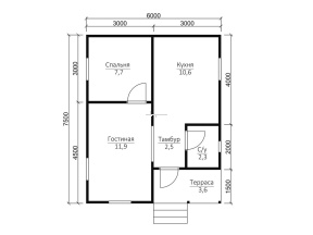 Дом имеет размеры 6х7,5 м. и занимает площадь кв.м.. В доме всегда будет светло – во всех помещениях предусмотрены двойные стеклопакеты. Размеры комнат достаточны для комфортного загородного проживания. Крыша дома двускатная из ондулина предложенной расцветки: коричневой, зеленой или красной.